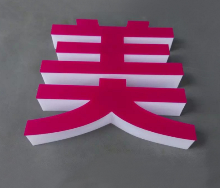 一般是雙層的亞克力制作,下面是透明的亞克力(一般厚度有5mm,8mm, 10mm), 面板是3mm厚的帶顏色亞克力。采用粘合方法連接在一起,從側方看有水晶的效果,俗稱“水晶字”。
