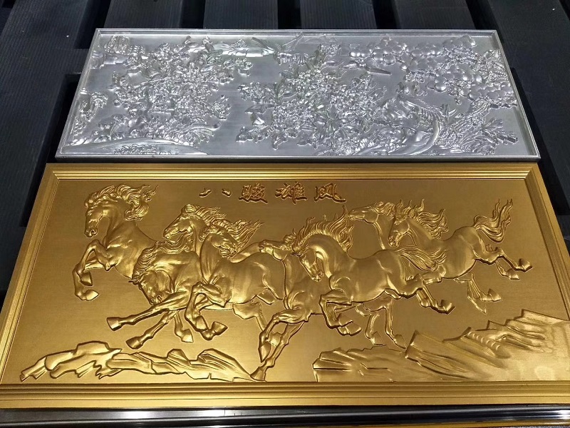 銅鋁浮雕主要應用在裝飾裝修行業和廣告標識標牌行,如銅鋁門窗、護欄、屏風、樓梯、家具、金屬標牌等。杰克銅鋁浮雕機可制作陽雕和陰雕效果,浮雕厚度可自行設置。